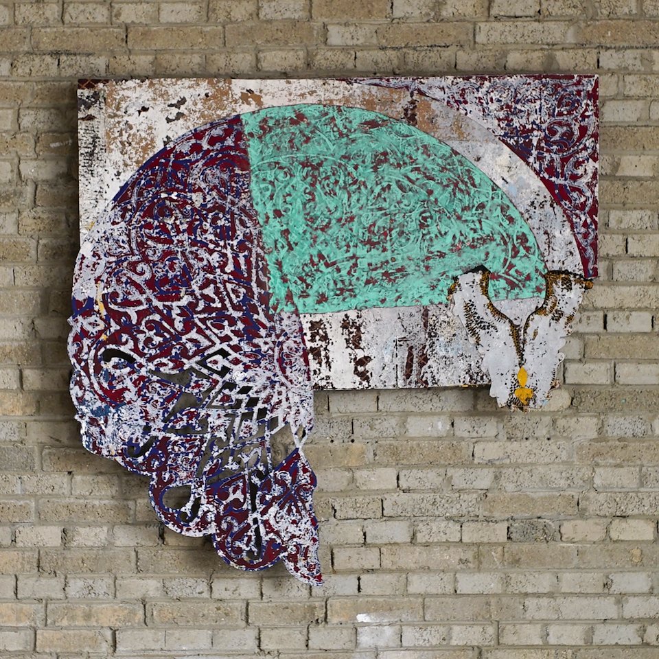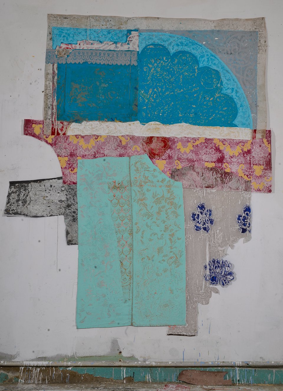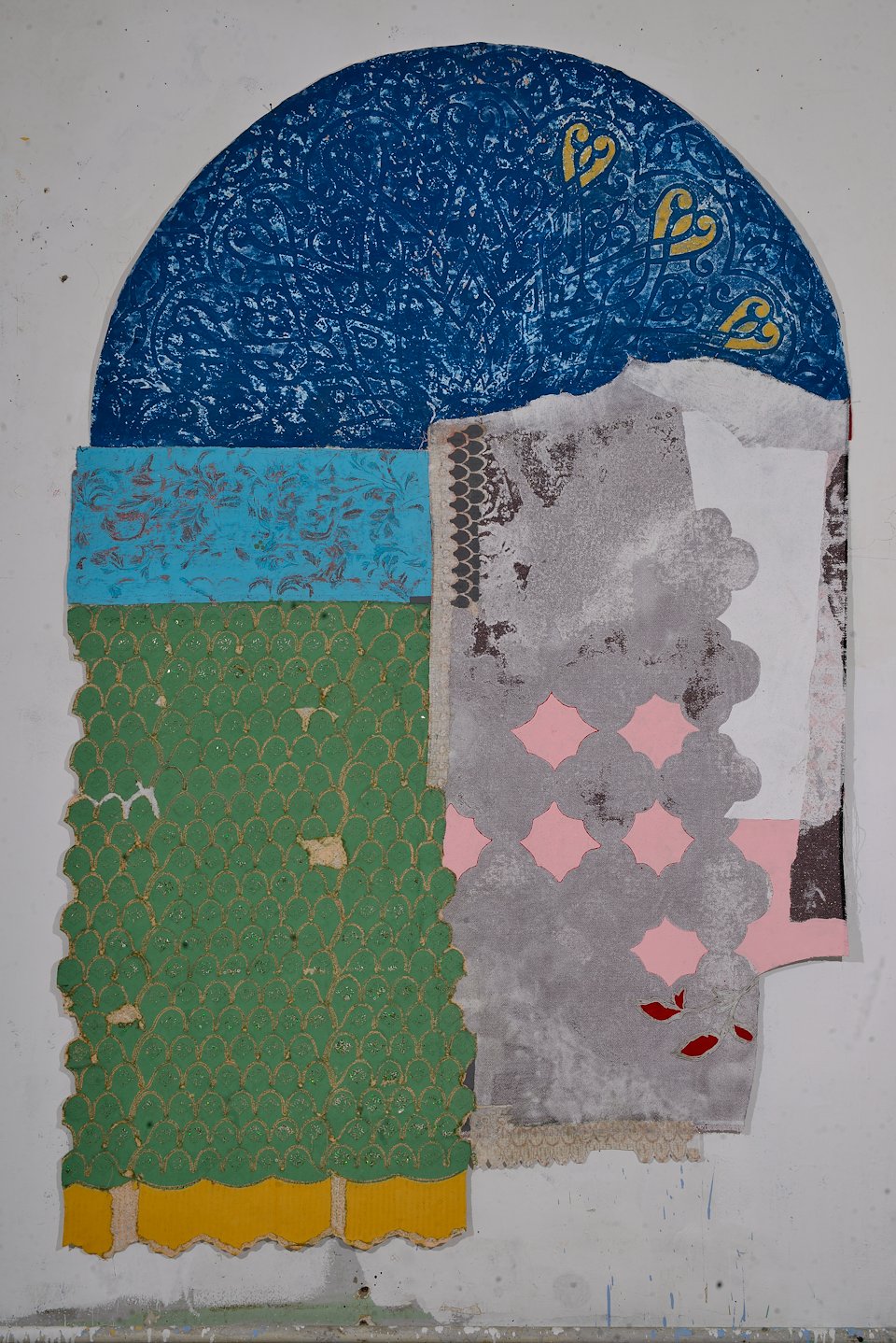 This latest body of work, Ard El Lewa, explores themes such as transnational identity, migration and borderlessness. The mixed media pieces are composed of an assemblage of cloth fragments painted with acrylic wall paint and later distressed and faded. They visually quote tapestry traditions found across the Silk Road countries and beyond. Formalistically the pieces recall various decorative motifs, architectural elements and artistic references shared by a variety of cultures despite the modern constructions of insular so-called authentic national cultures. The works, created in one of Cairo’s popular yet marginalized urban areas, stem from my personal immigrant experience. Ard El Lewa is a collection of works about ambiguity, in-betweeness, and the fallacy of authenticity as a governing concept for identity construction.