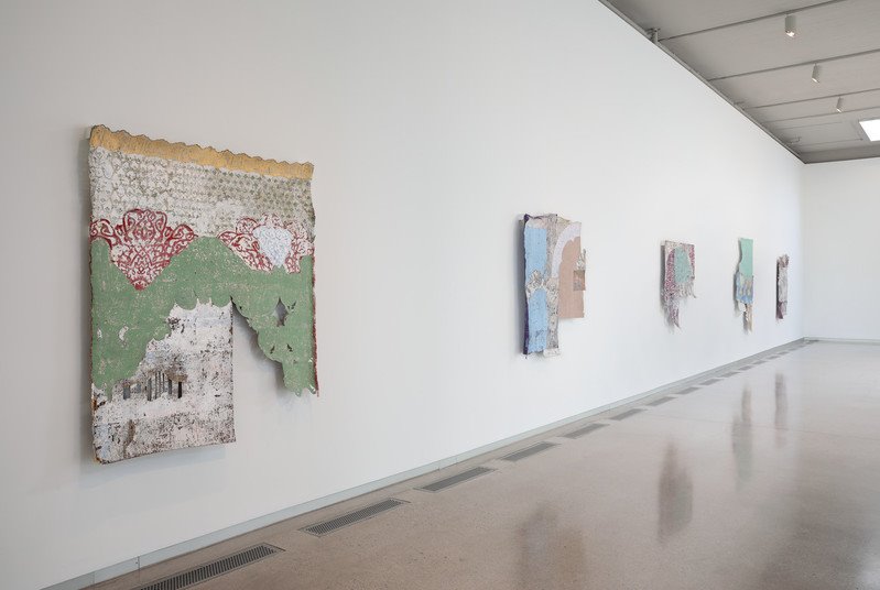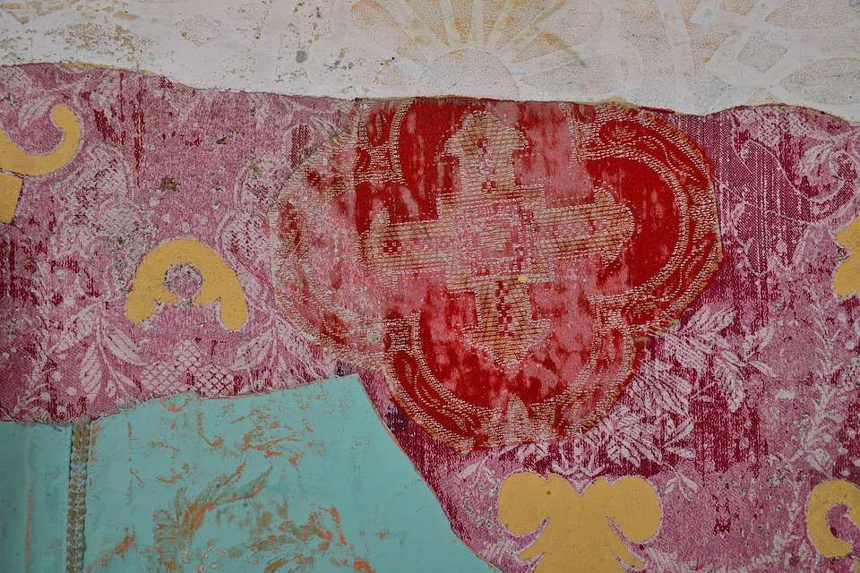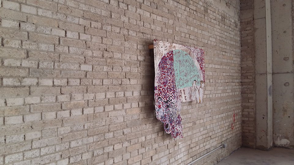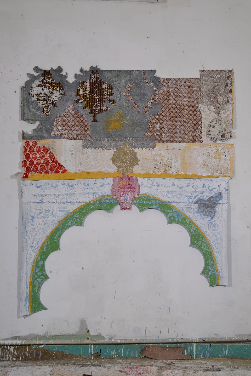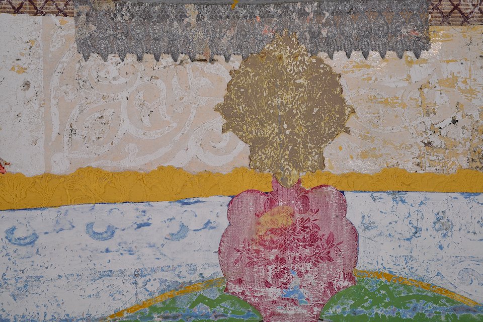This latest body of work, Ard El Lewa, explores themes such as transnational identity, migration and borderlessness. The mixed media pieces are composed of an assemblage of cloth fragments painted with acrylic wall paint and later distressed and faded. They visually quote tapestry traditions found across the Silk Road countries and beyond. Formalistically the pieces recall various decorative motifs, architectural elements and artistic references shared by a variety of cultures despite the modern constructions of insular so-called authentic national cultures. The works, created in one of Cairo’s popular yet marginalized urban areas, stem from my personal immigrant experience. Ard El Lewa is a collection of works about ambiguity, in-betweeness, and the fallacy of authenticity as a governing concept for identity construction.