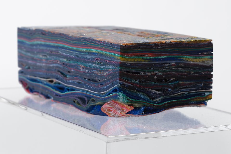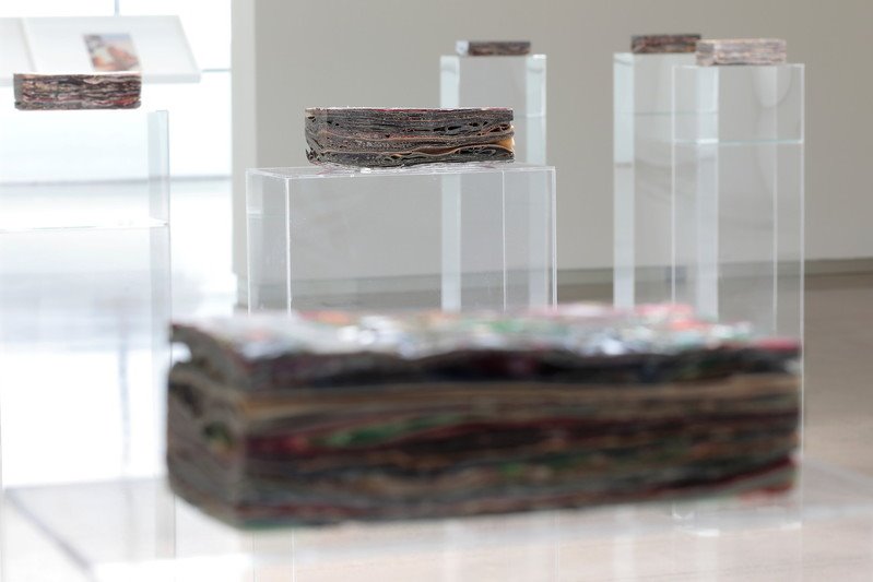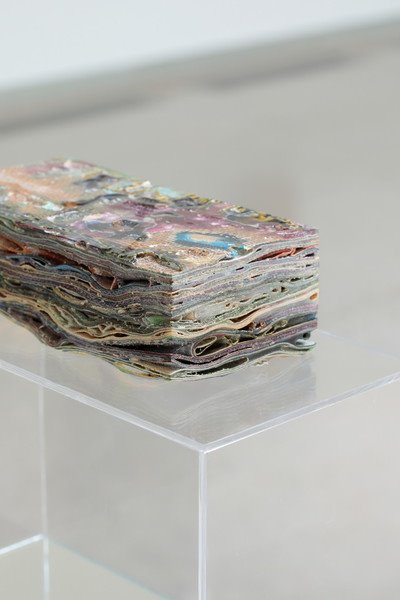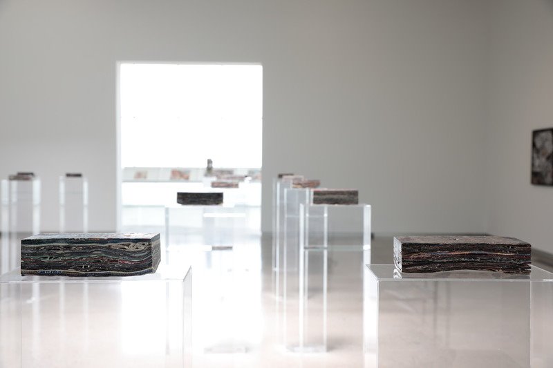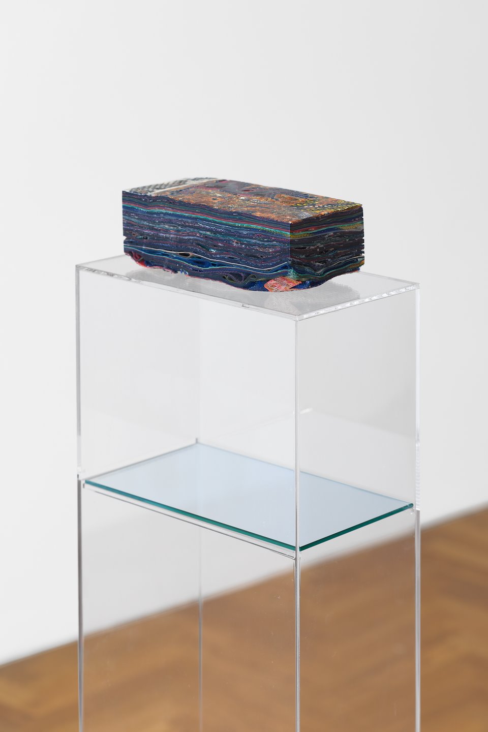 Following up on my previous series of works Ard El Lewa, this work builds on Cairo’s most common construction material, bricks. Each brick is comprised of approximately 100 layers of textiles from around the world, particularly the global south, available in local markets. Bricks are the fundamental building units of Cairo’s, and Ard El Lewa’s, architecture, it is also a global building material that is transnational and omnipresent. Each unique piece is created through a production process that involves local laborers as well as refugees in Ard El Lewa, thus the works emerge from the area’s south-south cosmopolitanism, national uncertainty and marginality both in terms of social class and national belonging. The tension between the appearance of hardness, associated with bricks, and their materiality, compiled layers of textile, challenge accepted notions of perception and reality. Each sculpture holds its own aesthetic characteristics revealing different pieces of the many components that create its solidity, yet presented together, the work displays commonalities and similarities as they are formed from the same strands. Fragments of numerous cultures create seemingly individual units with more in common than meets the eye.