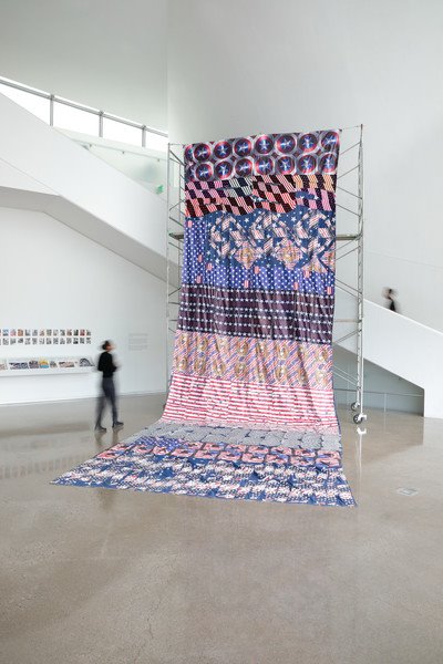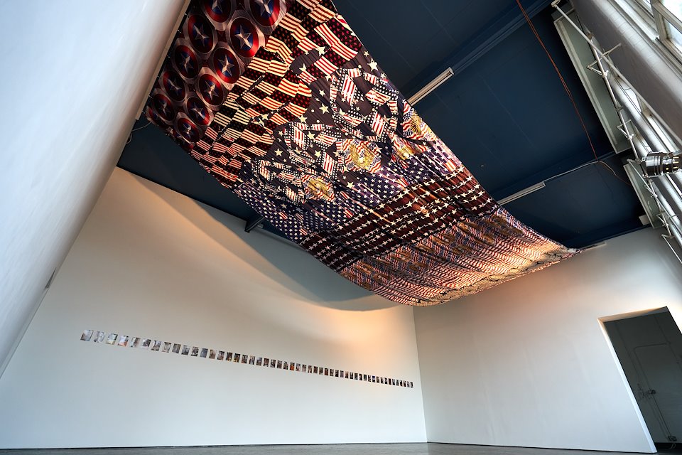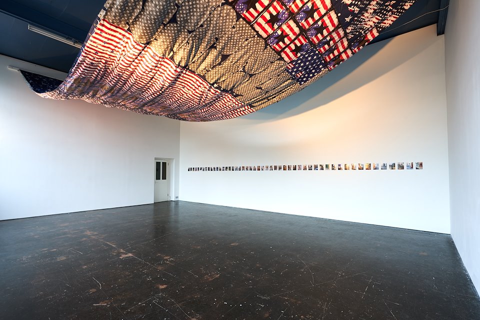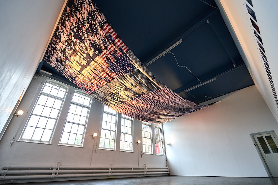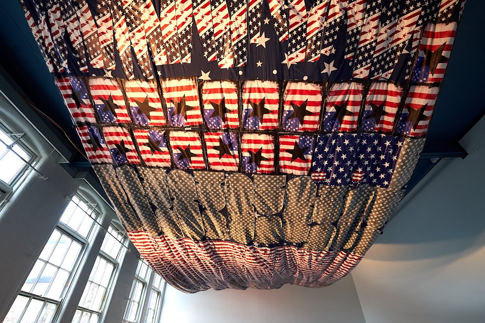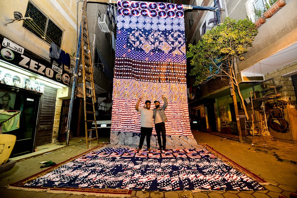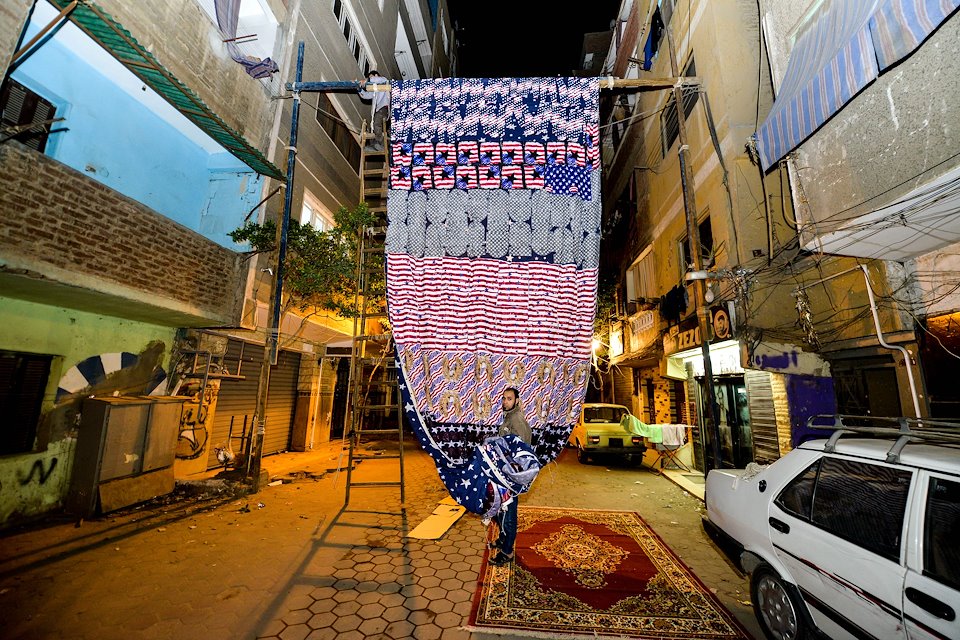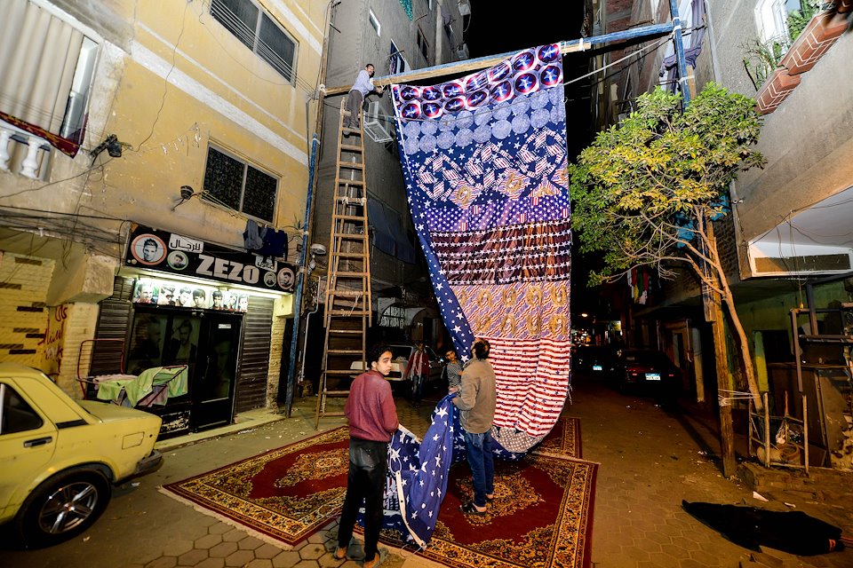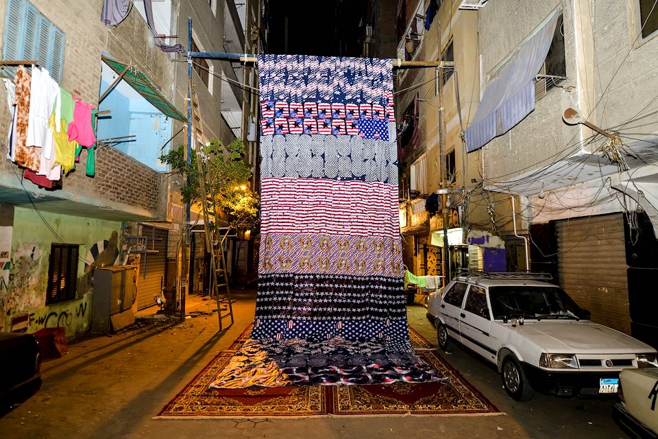 “Does Anybody Leave Heaven?" is an assemblage tapestry made with textile items found in Egyptian street markets, clothing, bags and other items, which are printed with the flag of the United States of America. I live in a popular working class area, where most of my social network there is composed of young males who have not been able to travel outside Egypt. When explaining in conversation that I left the US to relocate to Cairo in 2014, I am consistently asked the question, “Does Anybody Leave Heaven?” In the world of my peers, Cairo is a place to escape and the USA is a place to dream about arriving at its shores. The piece presented at the Havana Biennial is a commentary on the constructed mythology and fetishism surrounding the US as a place of desire and opportunity, particularly by underprivileged young males who have normalized wearing the American flag in the streets of Cairo where popular markets supply this imagery on a variety of wearable products. The installation, hanging across the ceiling, resembles the ceiling paintings in ancient Egyptian temples that are adorned with night skies and yellow stars.