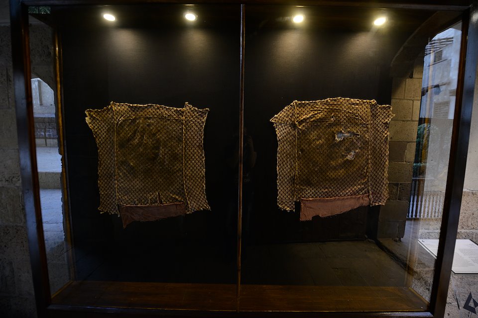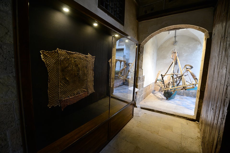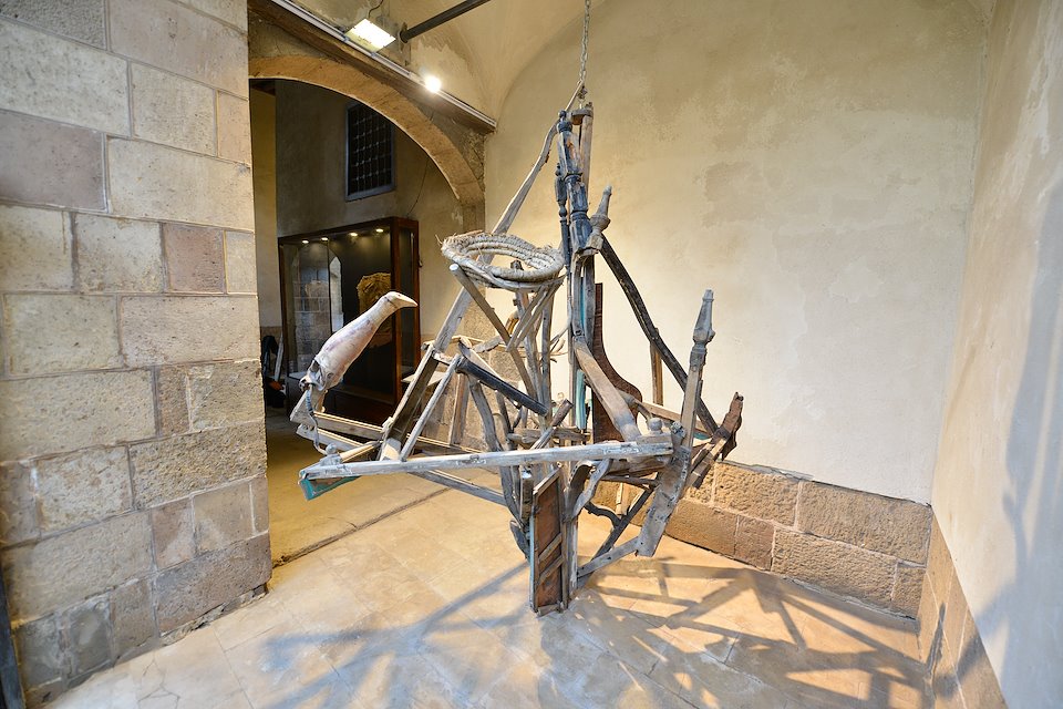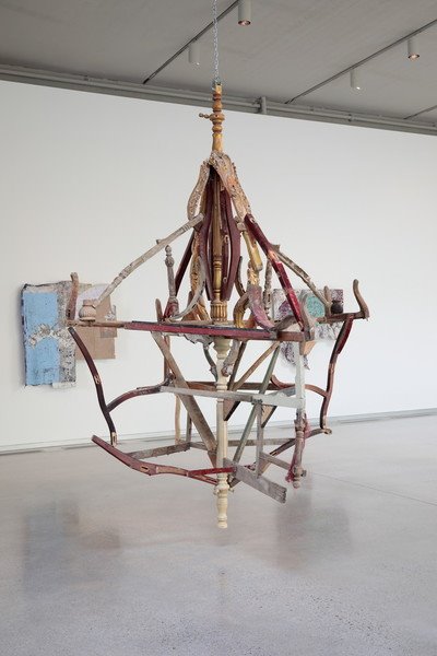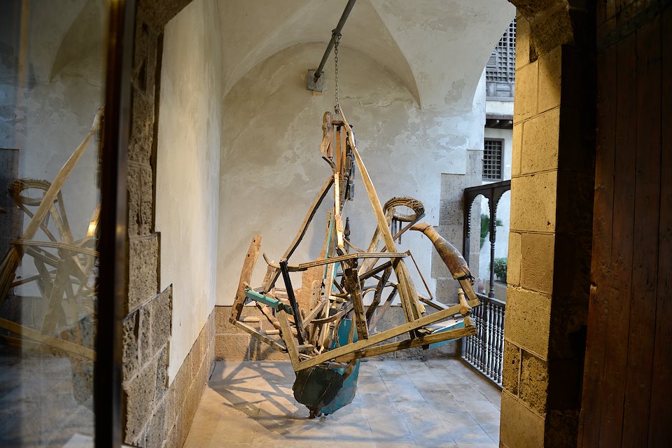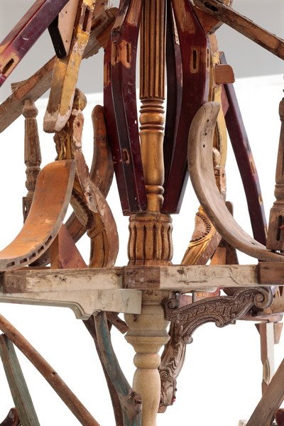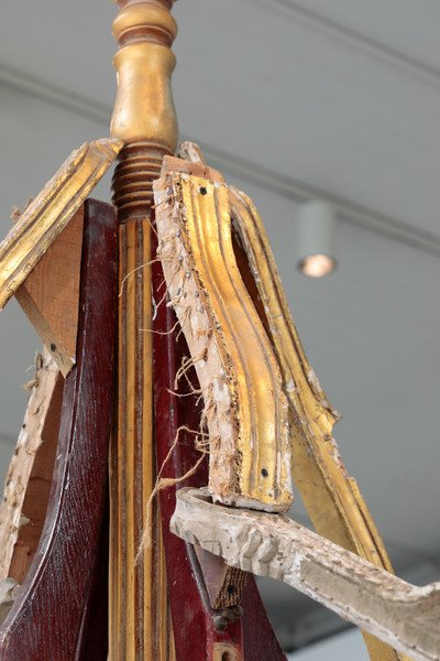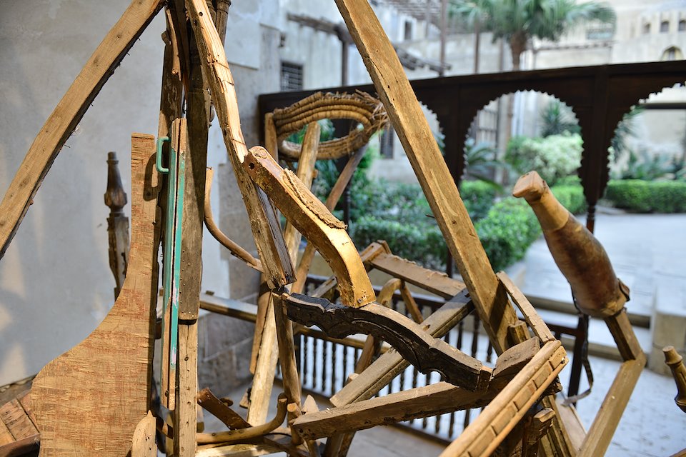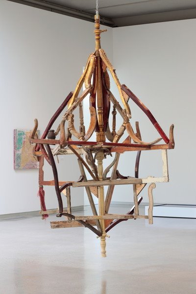The works, including a chandelier and two textiles pieces encased within a vitrine, are assembled from disused objects, such as armchairs, window frames, and a prosthetic leg, found on the roof of the Elias Cannacé & Fils building, off of al-Mu’iz Street. This factory space belonged to a prominent Jewish family, who left Egypt during the Nasser era. Installed in the House of Sahimi, they create a dialogue with the surrounding area that is precisely curated, heavily preserved, and with a profoundly controlled historical narrative. The objects that come into our view have power; they shape the way we see ourselves. With this intervention, the artist invites viewers to interrogate the sterilization of the city’s history.